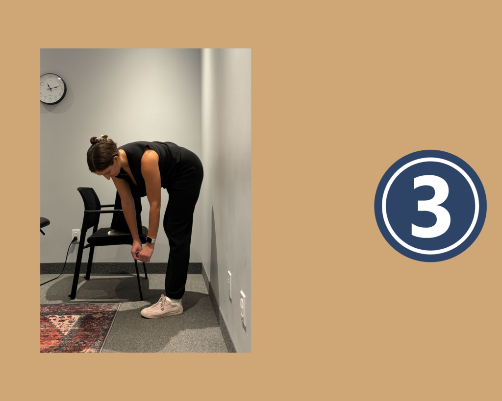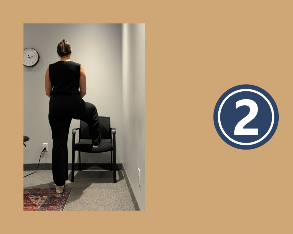 - Lift one foot up and rest it on the chair/stool in front of you. You are targeting the SI joint on the side of the lifted foot.