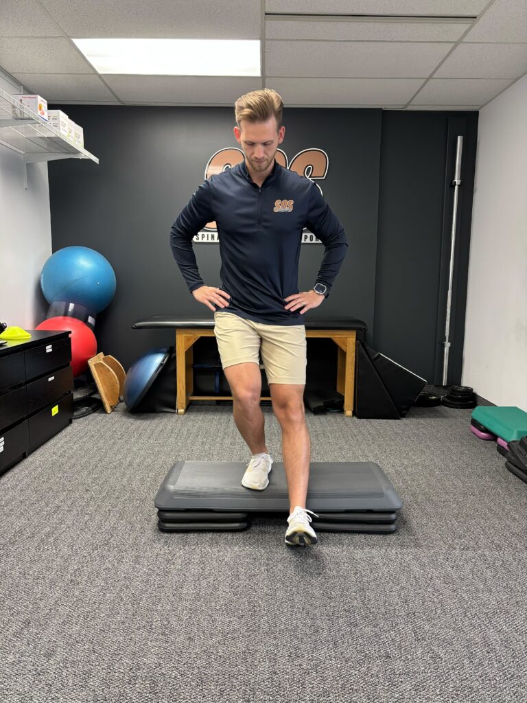 2. Pick one leg to be your stance leg and one to be your step leg. Slowly begin to step down off the step while keeping your stance leg planted. The key to this motion is to try and track your knee over top of your first and second toes, not allowing your knee to cave in towards your midline. A cue to think about is trying to activate your glute muscles on the stance leg in order to control your knee.